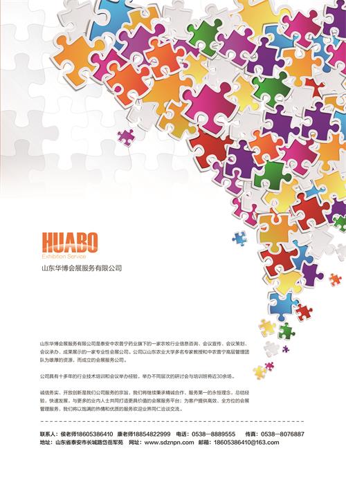 山東華博會展服務(wù)有限公司是泰安中農(nóng)普寧藥業(yè)旗下的一家農(nóng)牧行業(yè)信息咨詢、會議宣傳、會議策劃、會議承辦、成果展示的一家專業(yè)性會展公司。公司以山東農(nóng)業(yè)大學(xué)多名專家教授和中農(nóng)普寧高層管理團(tuán)隊為雄厚的資源,而成立的會展服務(wù)公司。
