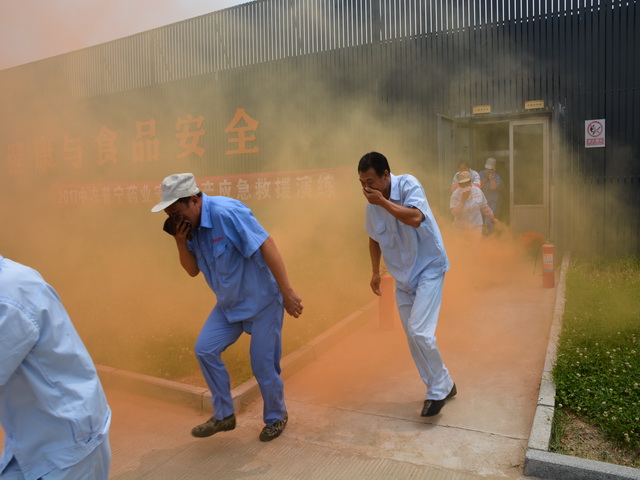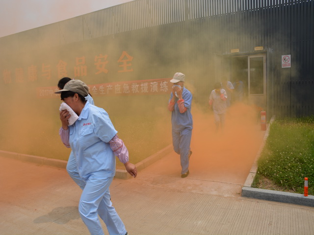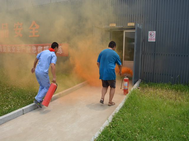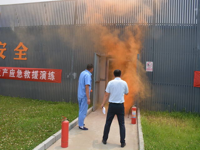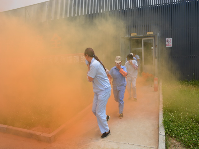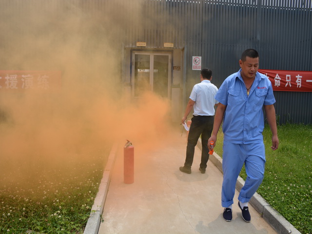 為了使演練現(xiàn)場更加逼真,生產(chǎn)部準備了煙霧彈。11:20分,隨著紅色煙霧迅速彌漫生產(chǎn)車間門口,生產(chǎn)部發(fā)現(xiàn)有火情,由報警組立即向總經(jīng)理康總報告,康總隨即下達命令啟動消防應(yīng)急預(yù)案與緊急逃生指令,車間主任第一時間按響警報鈴,同時模擬撥打火警電話,各應(yīng)急小組聽到鈴聲后各司其職,應(yīng)急疏散組在車間指揮有序疏散,為員工緊急疏散指明方向。水電組迅速切斷車間電源,救護組清點人員全部安全撤離到集合地點,11:23分全部人員成功撤離。